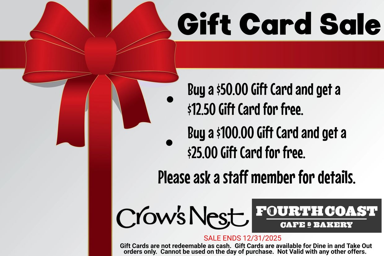 You can come in and purchase a classic gift card upstairs at Crow's Nest or downstairs at Fourth Coast Cafe. You will receive your free Gift Card for the sale at time of purchase.